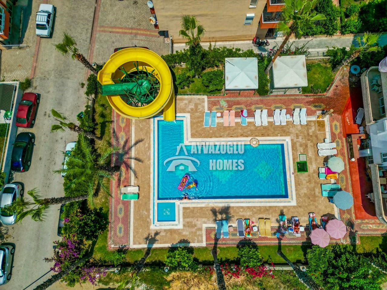 Ausstattung der Anlage: Außenpool, Wasserpark, Sauna, Ruhezonen mit Kamelien, Aufzug, Generator und Hausverwaltung.