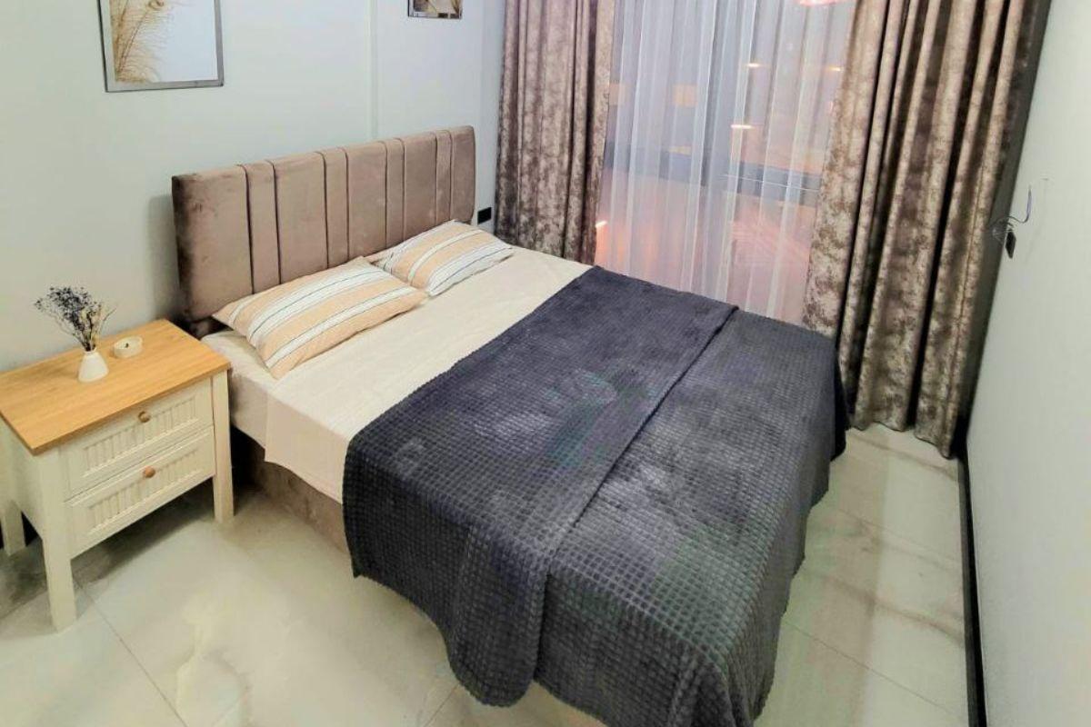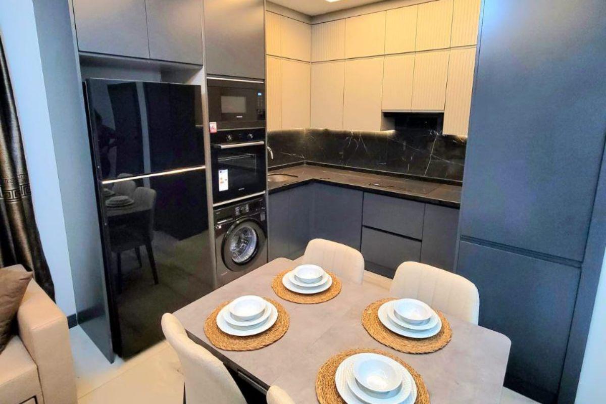 Die 55 m² große 1+1-Wohnung umfasst ein Wohnzimmer mit offener Küche, ein Schlafzimmer, ein Badezimmer und einen Balkon. Die Wohnung befindet sich im 4. Obergeschoss, ist komplett möbliert und bezugsfertig.