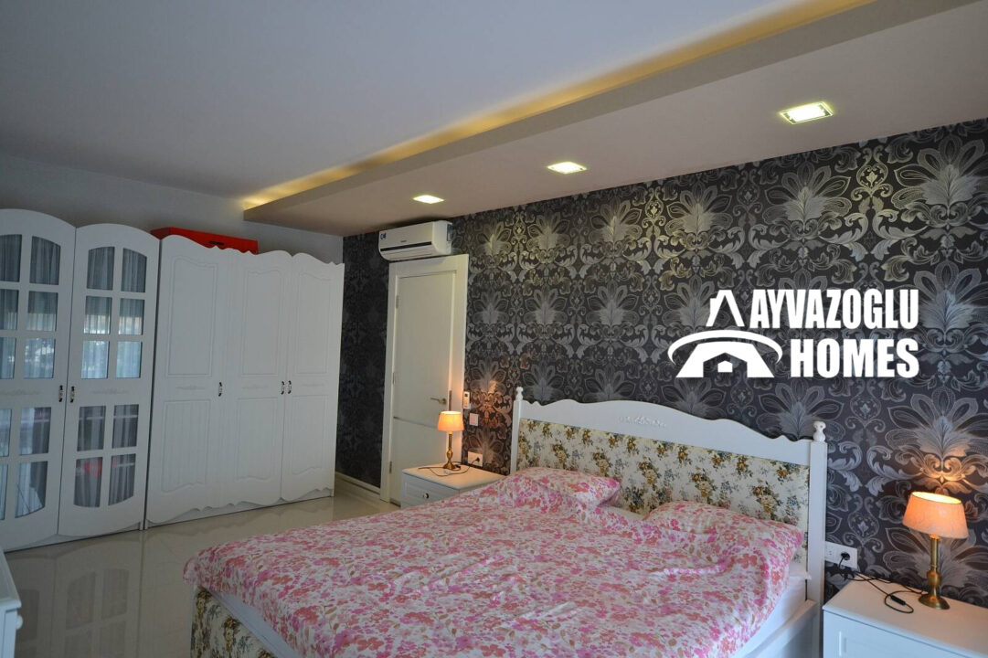 Private villa in the Kargicak area with a 4+1 layout, 280 sq. m. The layout of the villa includes a living room combined with a kitchen, 4 bedrooms, 2 bathrooms, a large terrace with a beautiful view. The villa has been renovated with high-quality materials. The bathrooms are equipped with showers and modern plumbing, one of them has a bathtub. Hot water is supplied by an electric water heater. All rooms have air conditioners. The villa is fully furnished and ready for occupancy.