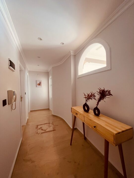 Планировка включает в себя гостиную с кухонной зоной, две спальни, две ванные комнаты, три балкона. Квартира построена по высоким стандартам с использованием современных материалов. Ванные комнаты оборудованы душевой кабиной и современной сантехникой. Горячее водоснабжение обеспечивается электрическим водонагревателем.
