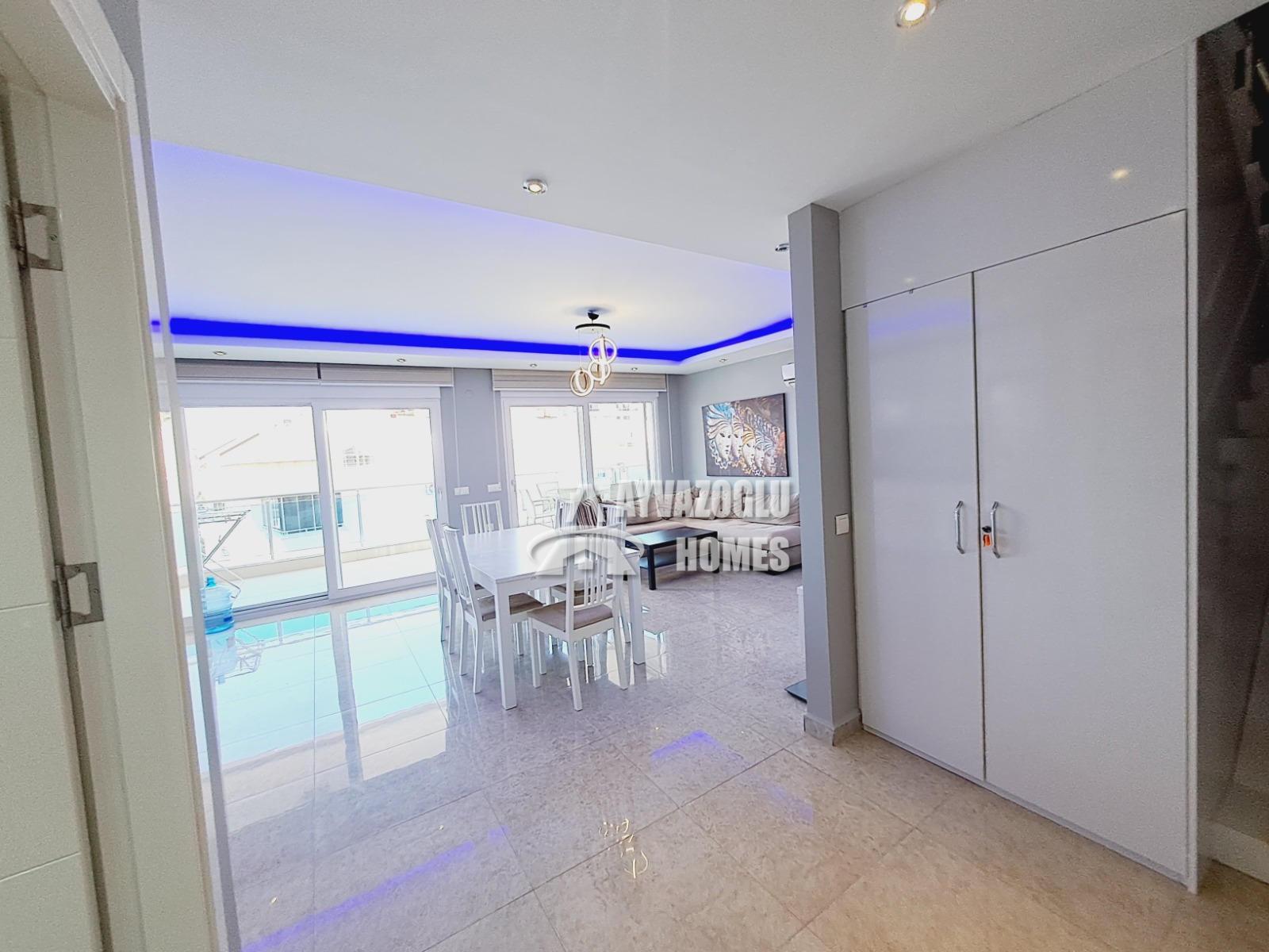 This 2+1 apartment, 120 m², is located on the 5th floor of a modern residential complex in the Tosmur district, just 1,200 meters from the sea. Built in 2013, the complex is well-maintained and fully functional, ideal for both permanent residence and vacation rentals.