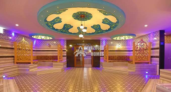 Complex amenities include: outdoor pool, water slide, indoor pool, fitness center, sauna, hammam, steam room, cafe, restaurant, tennis court, basketball court, children's play areas, outdoor parking, and 24/7 security.