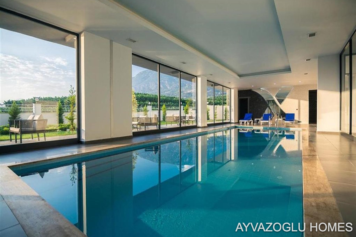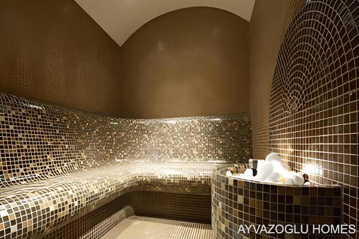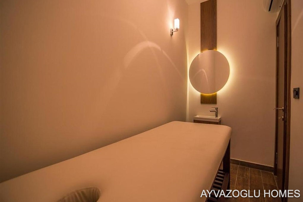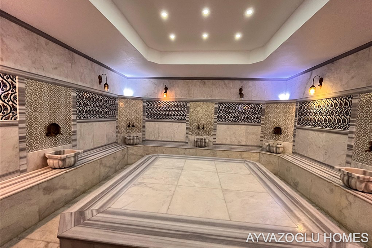 a water park and outdoor pool, an indoor pool, a hammam, a sauna, a steam room, massage rooms, a cinema, a cafeteria, indoor and outdoor recreation areas, and an indoor and outdoor children's play area.
